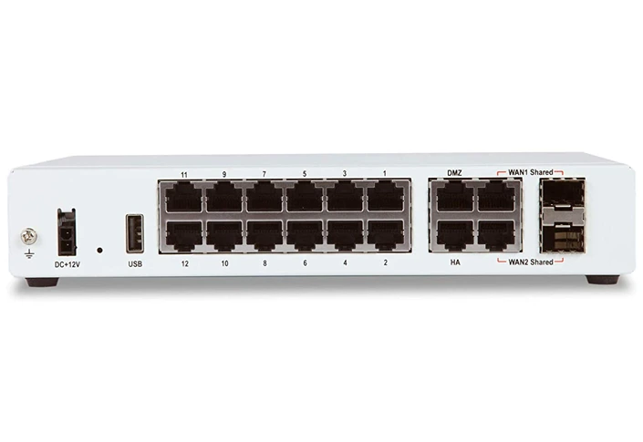 | Interfaces | 14x GE RJ45 ports (including 1x DMZ port, 1x Mgmt port, 1x HA port, 12x switch ports), 2x Shared Media pairs (including 2x GE RJ45 ports, 2x SFP slots) |